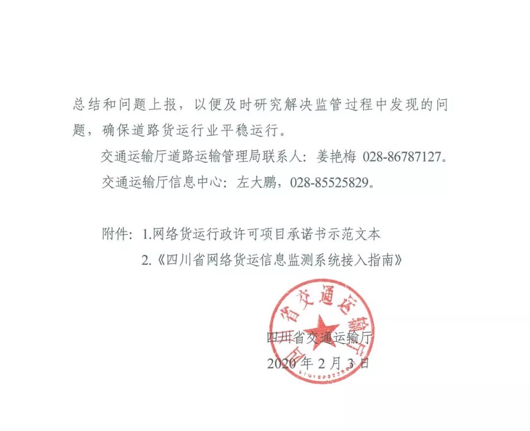近日,四川省交通运输厅转发了关于《网络平台道路货物运输经营管理暂行办法》等文件的通知!通知中还提供了《网络货运行政许可项目承诺书示范文本》(附件1),以及《四川省网络货运信息监测系统接入指南》(附件2),标志着四川省网络货运政策落地!
